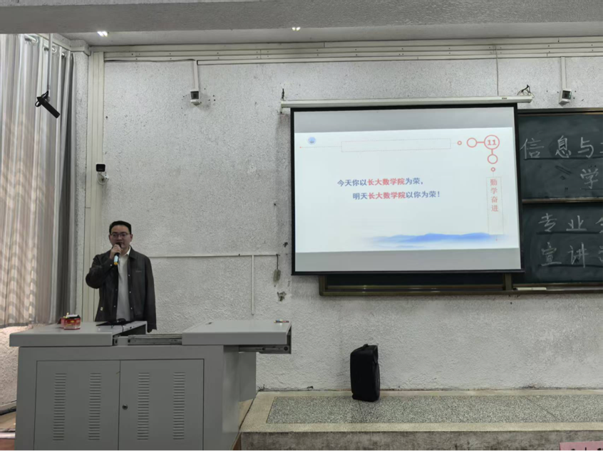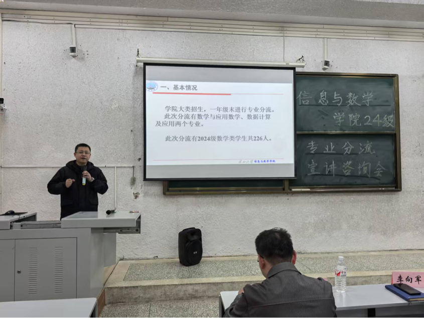 西校区5教103室举办2024级本科生专业分流宣讲会。参加本次会议的有分管教学副院长李向军、院长助理邹健、数学与应用数学系主任严政,会议由辅导员吴朝晖主持。本次会议旨在帮助24级学生深入了解数学类各专业特色,科学合理地选择专业,明确发展方向。