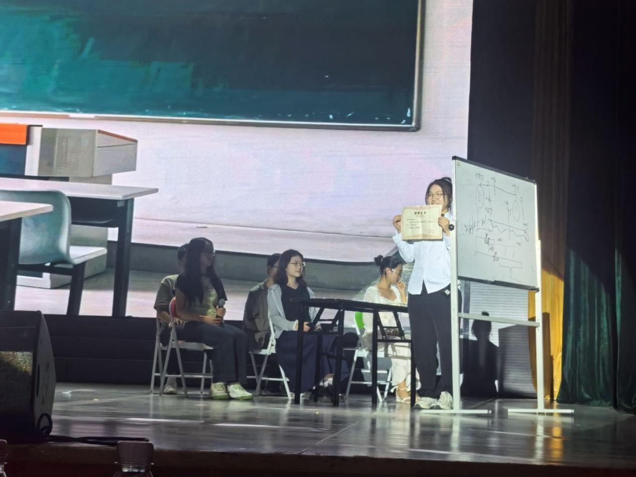 决赛当晚,大礼堂座无虚席。由周阳担任导演、王嘉怡领衔主演的《镜中茧》在全场期待中登场,在吴朝晖老师的精心指导下,该剧以极具张力的戏剧语言解构当代大学生的心理困境 —— 剧中主角苏晓佳被 “完美主义" 的枷锁层层束缚,表面维持着 "别人家孩子" 的光鲜形象,却在母亲苛责的期待与演讲台忘词的意外中濒临崩溃。随着剧情推进,在好友林小夏的陪伴引导下,苏晓佳逐步撕开 "虚假完美" 的面具,当那条象征伪装的 "笑脸围巾" 被缓缓摘下时,演员们通过细腻的肢体语言与极具感染力的台词,将角色从自我禁锢到心灵觉醒的蜕变过程刻画得入木三分,现场观众在共鸣的掌声中感受着破茧成蝶的心灵震撼。