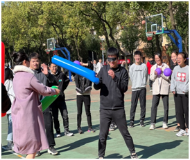接下来举行的“踩气球”比赛项目,每组选取四人,分别充当“手”、“嘴”、“脚”、“屁股”四个角色。由“手”将气球拿给“嘴”,“嘴”将气球吹大,并由“手”将气球系好带给“脚”,“脚”通过双腿夹住气球带给“屁股”,最终由“屁股”将气球坐爆!通过第一个比赛项目的磨合,同学们在此环节配合的更加默契了,以惊人的速度顺利完成比赛!紧接着我们开始了第三个项目“蒙眼气球搏击”。每组派出两名选手,戴上遮眼罩后通过队友的指挥开始搏击,被击到的同学淘汰出局。该项目大大增强了队友间的信任感!