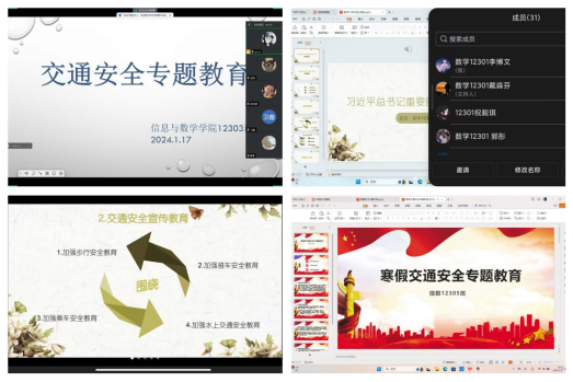 学生离校情况,综合分析了寒假及春节面临的交通复杂形势,接着辅导员吴朝晖从交通安全、消防安全、网络安全、预防诈骗、居家安全、谨防溺水、预防自然灾害、公共安全等多个方面对学生进行全方位的安全常识教育。其次,班主任通过线上会议带领同学们认真学习假期安全知识,围绕卫生与健康、用火用电安全、饮食安全、出行安全、平安过节共五个方面,切实加强对同学们的自我防范和自我保护教育,并结合具体案例强调寒假个人出行的防护措施和方法。