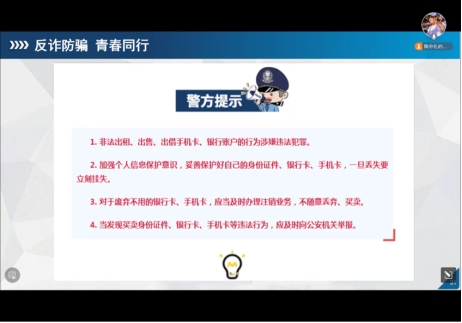 班会还对学生进行了包括人身与财产安全、消防电器使用安全、网络诈骗等在内的全方位安全教育,会中特别强调了网络诈骗问题,并针对近年频发的电信诈骗问题又进行了防范电信网络诈骗的宣讲,通过各项诈骗案例以及诈骗方式向大家展示诈骗的危害性,并提醒同学们下载、安装、注册国家反诈中心APP。安全稳定是一切生活活动顺利进行的基础,要求学生筑牢个人安全防线,提高辨别能力,遇到困难时能及时与辅导员沟通联系。此外,各班还组织学生签署了《开学安全责任告知书》,确保做到安全责任书签署的全覆盖。