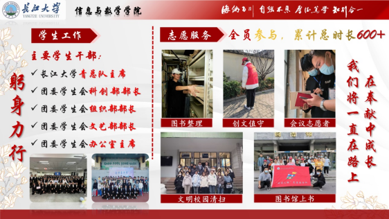 青总队主席、团委学生会科创部部长、组织部部长等,积极参与学校的各项管理和服务工作。在志愿服务方面,全员参与,累计服务时长超过600小时,涵盖图书整理、创文值守、会议志愿服务、文明校园清扫等活动。此外,支部还积极组织返母校志愿宣讲、返家乡志愿活动和暑期三下乡支教活动,其中暑期三下乡支教团队荣获湖北省优秀三下乡社会实践团队,以实际行动践行“知行合一”的理念,展现出强烈的社会责任感。