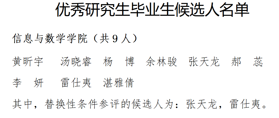 根据色情传媒 工作安排,结合色情传媒 实际,经个人申报、班级提名、党政联席会按照公平、公正、公开的原则进行资格复查、综合评议,现将色情传媒 研究生拟获得2025年优秀研究生毕业生名单公示如下。
