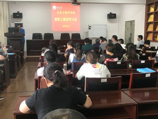 全体教职工集体进行政治理论学习。党委书记高迎斌带领大家学习了“中央宣传部负责人就《中国共产党宣传工作条例》答记者问”、《关于深化新时代学校思想政治理论课改革创新的若干意见》以及学校2019年暑期工作研讨会资料汇编,并详细解读了《教师岗位聘期考核与聘任管理办法(讨论稿)》《2019年学院(部)绩效工资分配方案指导意见(讨论稿)》;党建秘书卜富清带领大家一起学习了《直面现实 负重前行——党委书记朱业宏在中层干部培训研讨会上的讲话》《不忘初心 牢记使命 扎实推进“双一流”建设——校长冯征在2019年暑期工作研讨会上的讲话》。