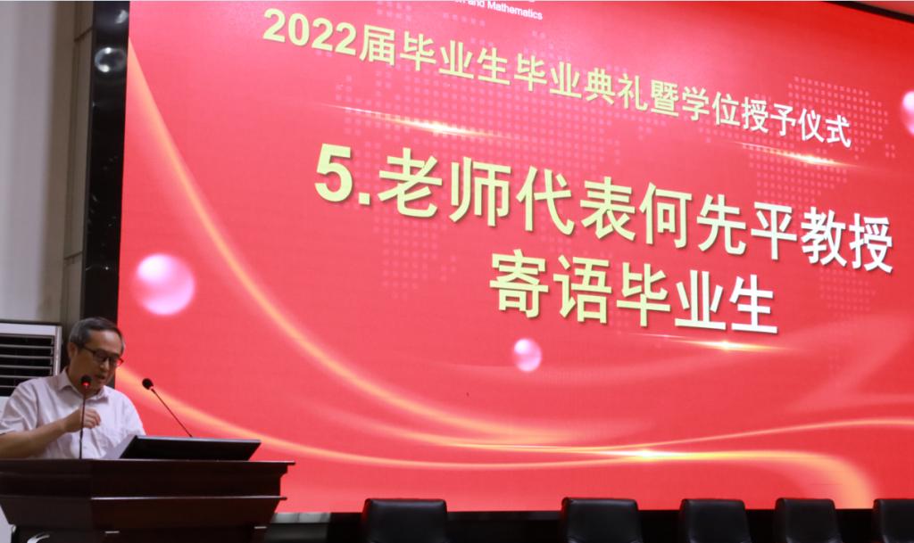 教师代表何先平教授表达了对毕业生们的不舍,更希望他们在今后的人生中继续学习。寄语中何先平还借用毛主席的话“你们青年人朝气蓬勃,好像早晨八九点钟的太阳。希望寄托在你们身上”希冀2022届毕业生们继续谱写辉煌,成为中华民族伟大复兴的脊梁。