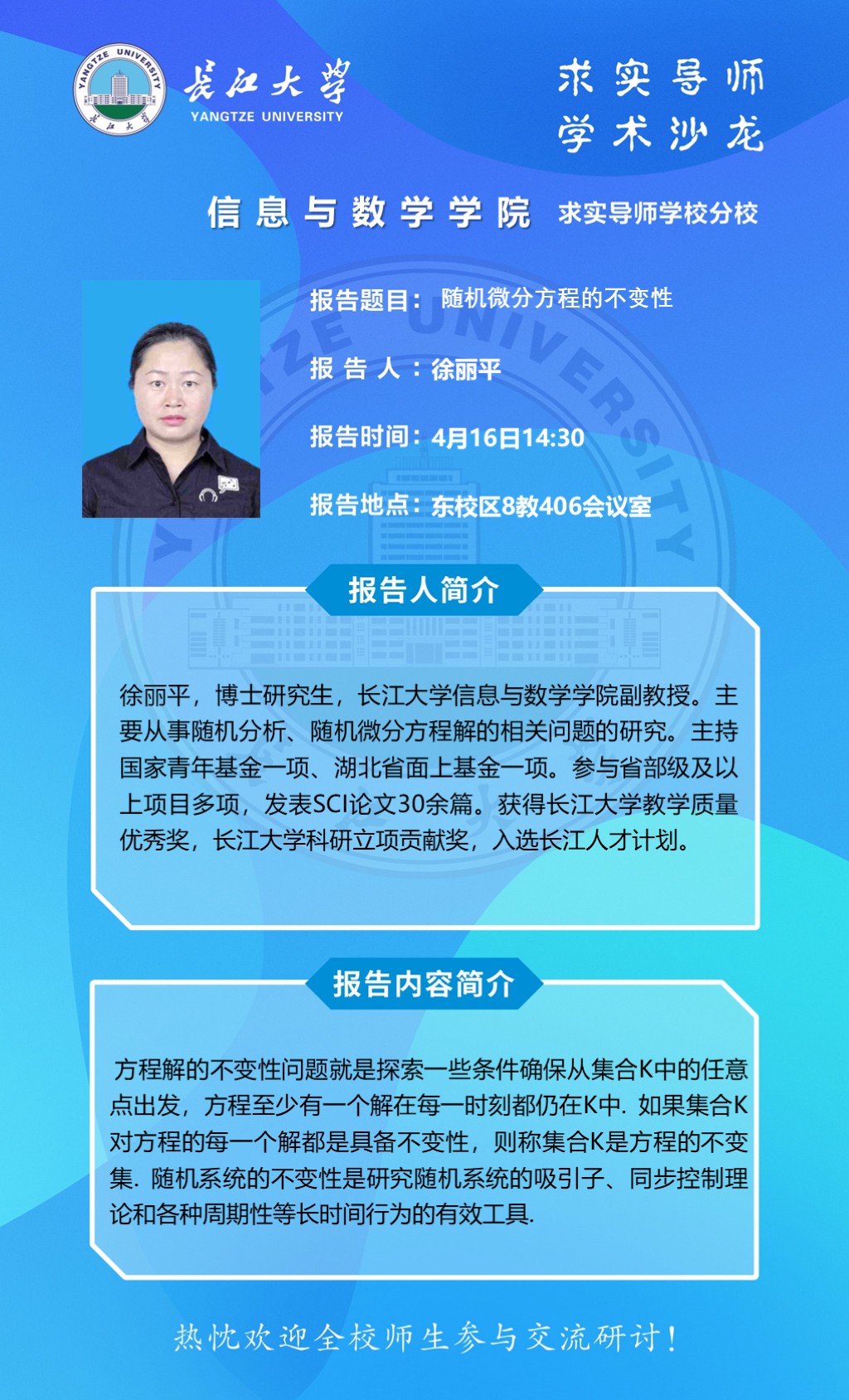 报告人 徐丽平 副教授 报告时间 2026年4月16日14:30