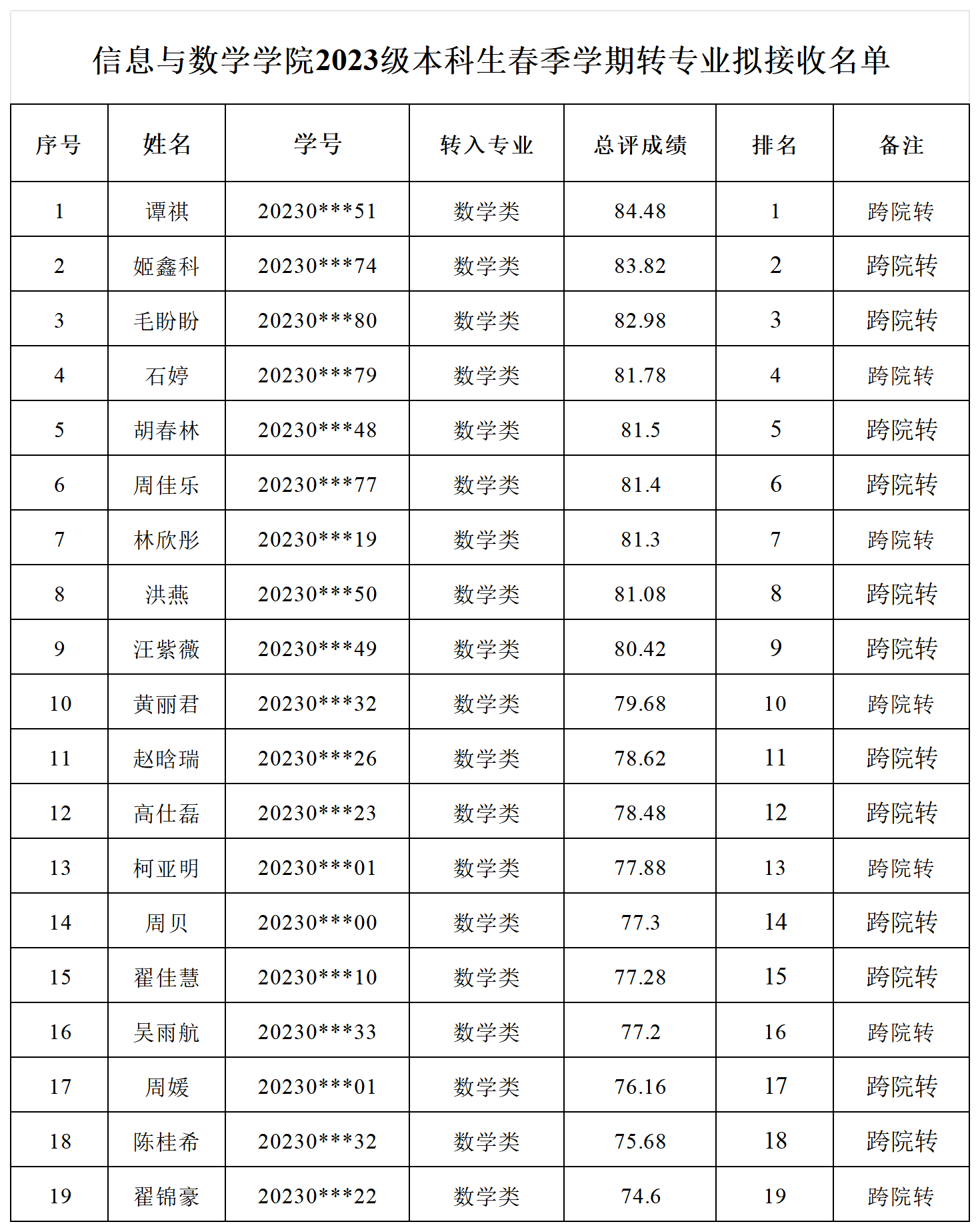 2023级本科生春季学期转专业拟接收名单予以公示。