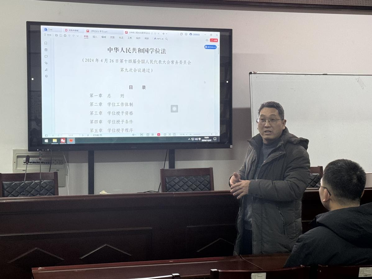 组织研究生召开了《中华人民共和国学位法》(以下简称《学位法》)学习交流会。全体研究生参加了此次会议,学院分管研究生工作的负责人李治副院长主持本次会议。