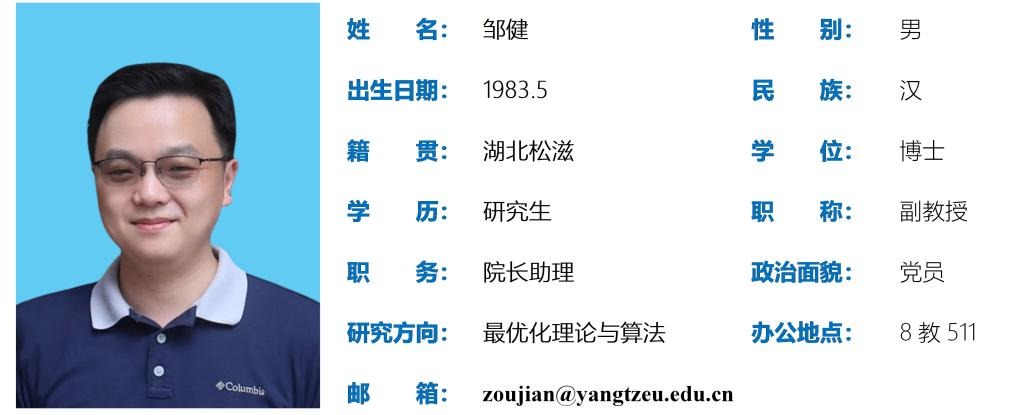 邹健,男,1983年5月出生,博士研究生,副教授。主要研究方向为最优化理论与算法、图像处理;主持完成国家自然科学基金1项;发表学术论文30余篇,其中被SCI检索20余篇;获得色情传媒