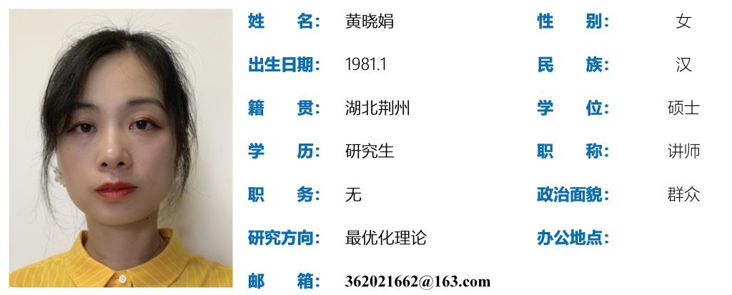 黄晓娟,女,生于1981年1月,硕士,讲师,主要研究生方向为最优化理论,获色情传媒 青年教师讲课比赛一等奖1项,三等奖1项,发表学术论文8篇,指导湖北省高校师范专业教学技能大赛获一等奖3项、二等奖2项。